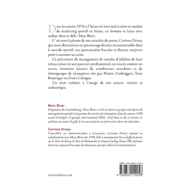 Ce précurseur du management de carrière d’athlètes de haut niveau relate ici son parcours professionnel, ses succès comme ses revers, itinéraire jalonné de nombreuses anecdotes et de témoignages de champions tels que Pirmin Zurbriggen, Tony Rominger ou Dario Cologna.
