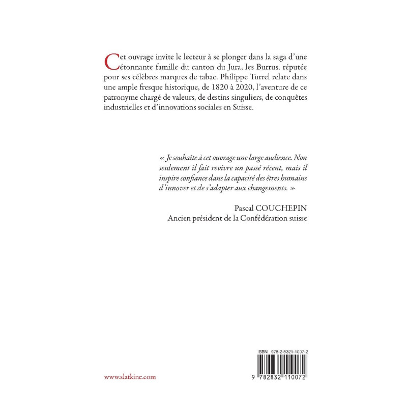 Cet ouvrage invite le lecteur à se plonger dans la saga d’une étonnante famille du canton du Jura, les Burrus, réputée pour ses célèbres marques de tabac. Philippe Turrel relate dans une ample fresque historique, de 1820 à 2020, l’aventure de ce patronyme chargé de valeurs, de destins singuliers, de conquêtes industrielles et d’innovations sociales en Suisse.