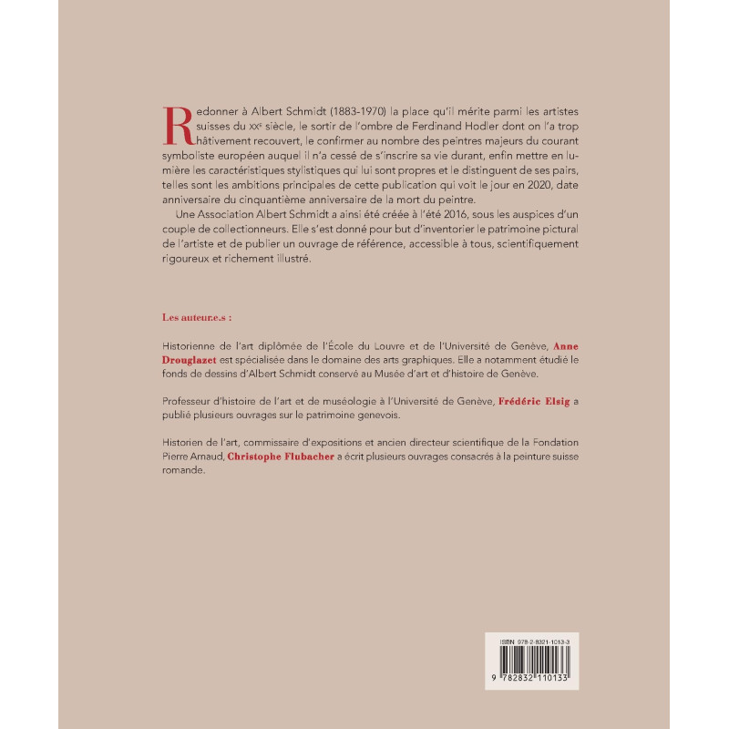 Redonner à Albert Schmidt (1883-1970) la place qu’il mérite parmi les artistes suisses du XXe siècle, le sortir de l’ombre de Ferdinand Hodler dont on l’a trop hâtivement recouvert, le confirmer au nombre des peintres majeurs du courant symboliste européen auquel il n’a cessé de s’inscrire sa vie durant, enfin mettre en lumière les caractéristiques stylistiques qui lui sont propres et le distinguent de ses pairs, telles sont les ambitions principales de cette publication qui voit le jour en 2020, date anniversaire du cinquantième anniversaire de la mort du peintre.
