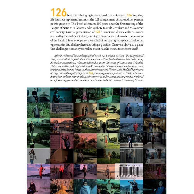 After the release of his autobiographical novel, Au Bonheur de Yaya (The Happiness of Yaya) – which deals in particular with emigration – Zahi Haddad returns here to the core of his studies: international relations. His studies at the University of Geneva and Columbia University in New York inspired this book’s exploration into how international cultural environments shape human beings. Author, entrepreneur and blogger, Zahi Haddad has focused his expertise and empathy to present 126 fascinating human portraits – 126 heartbeats – drawn from eighteen months of research, interviews and meetings, creating unique profiles of these fascinating personalities and their contribution to the international character of Geneva.