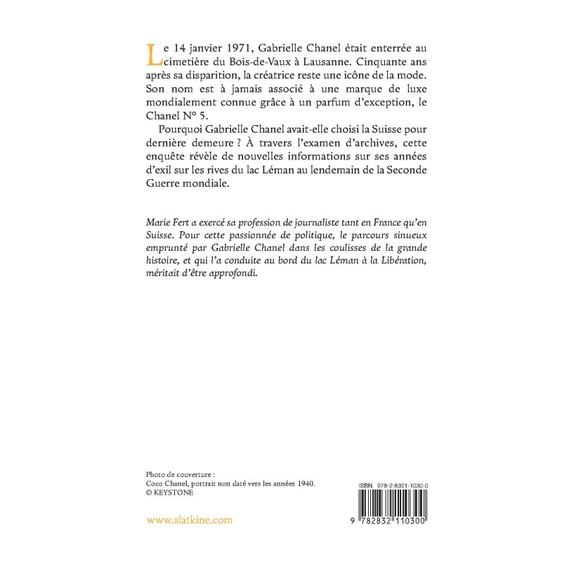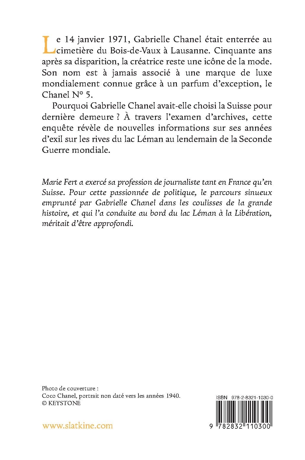 Marie Fert a exercé sa profession de journaliste tant en France qu’en Suisse. Pour cette passionnée de politique, le parcours sinueux emprunté par Gabrielle Chanel dans les coulisses de la grande histoire, et qui l’a conduite au bord du lac Léman à la Libération, méritait d’être approfondi.