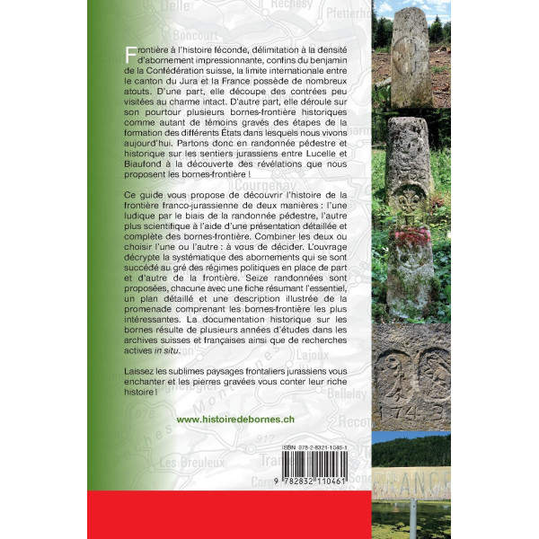 Ce guide vous propose de découvrir l’histoire de la frontière franco-jurassienne de deux manières : l’une ludique par le biais de la randonnée pédestre, l’autre plus scientifique à l’aide d’une présentation détaillée et complète des bornes-frontière. Combiner les deux ou choisir l’une ou l’autre : à vous de décider. L’ouvrage décrypte la systématique des abornements qui se sont succédé au gré des régimes politiques en place de part et d’autre de la frontière. Seize randonnées sont proposées, chacune avec une fiche résumant l’essentiel, un plan détaillé et une description illustrée de la promenade comprenant les bornes-frontière les plus intéressantes. La documentation historique sur les bornes résulte de plusieurs années d’études dans les archives suisses et françaises ainsi que de recherches actives in situ.