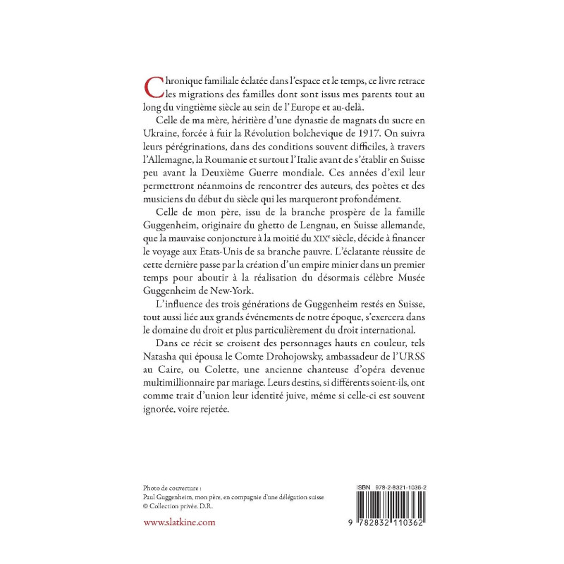 Celle de ma mère, héritière d’une dynastie de magnats du sucre en Ukraine, forcée à fuir la Révolution bolchevique de 1917. On suivra leurs pérégrinations, dans des conditions souvent difficiles, à travers l’Allemagne, la Roumanie et surtout l’Italie avant de s’établir en Suisse peu avant la Deuxième Guerre mondiale. Ces années d’exil leur permettront néanmoins de rencontrer des auteurs, des poètes et des musiciens du début du siècle qui les marqueront profondément.