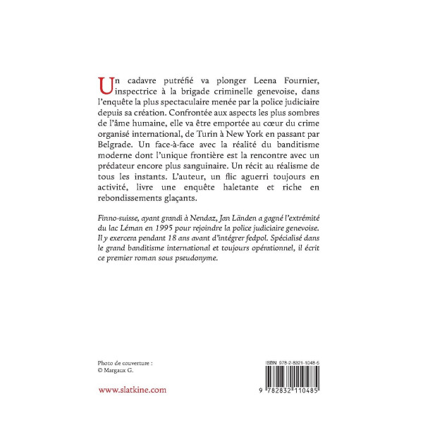 Un cadavre putréfié va plonger Leena Fournier, inspectrice à la brigade criminelle genevoise, dans l’enquête la plus spectaculaire menée par la police judiciaire depuis sa création. Confrontée aux aspects les plus sombres de l’âme humaine, elle va être emportée au coeur du crime organisé international, de Turin à New York en passant par Belgrade. Un face-à-face avec la réalité du banditisme moderne dont l’unique frontière est la rencontre avec un prédateur encore plus sanguinaire. Un récit au réalisme de tous les instants.