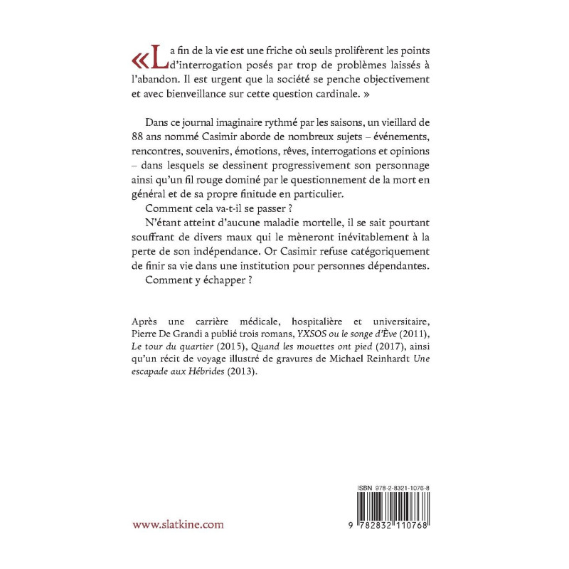 Dans ce journal imaginaire rythmé par les saisons, un vieillard de 88 ans nommé Casimir aborde de nombreux sujets – événements, rencontres, souvenirs, émotions, rêves, interrogations et opinions – dans lesquels se dessinent progressivement son personnage ainsi qu’un fil rouge dominé par le questionnement de la mort en général et de sa propre finitude en particulier.
