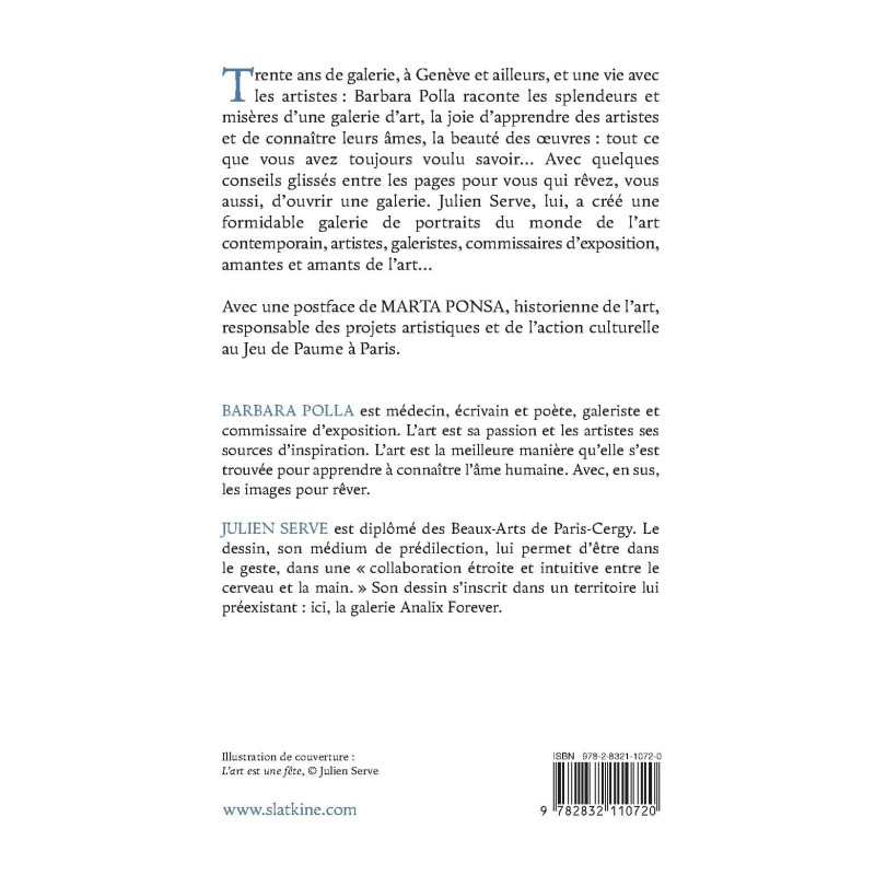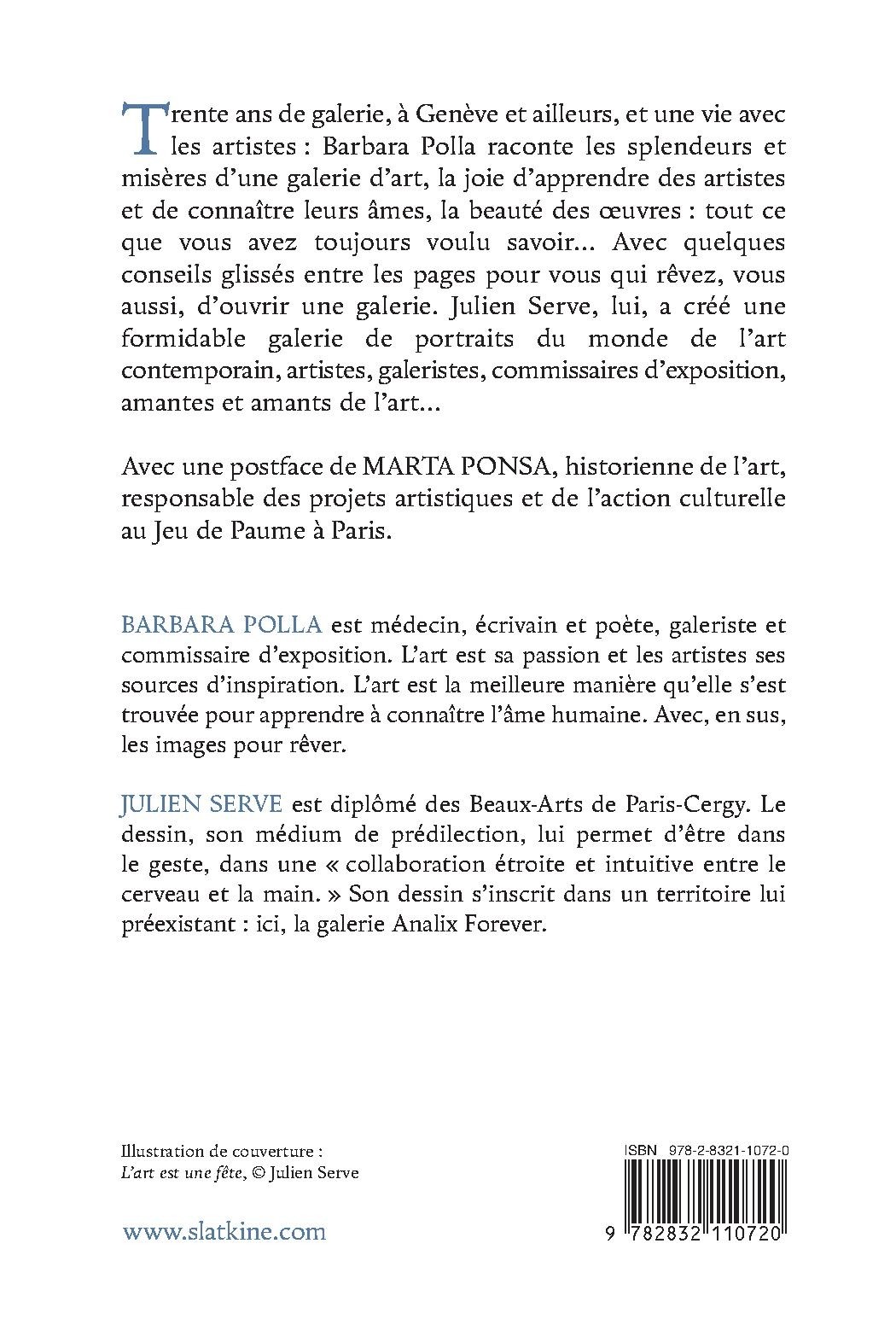 Trente ans de galerie, à Genève et ailleurs, et une vie avec les artistes : Barbara Polla raconte les splendeurs et misères d’une galerie d’art, la joie d’apprendre des artistes et de connaître leurs âmes, la beauté des oeuvres : tout ce que vous avez toujours voulu savoir… Avec quelques conseils glissés entre les pages pour vous qui rêvez, vous aussi, d’ouvrir une galerie. Julien Serve, lui, a créé une formidable galerie de portraits du monde de l’art contemporain, artistes, galeristes, commissaires d’exposition, amantes et amants de l’art…