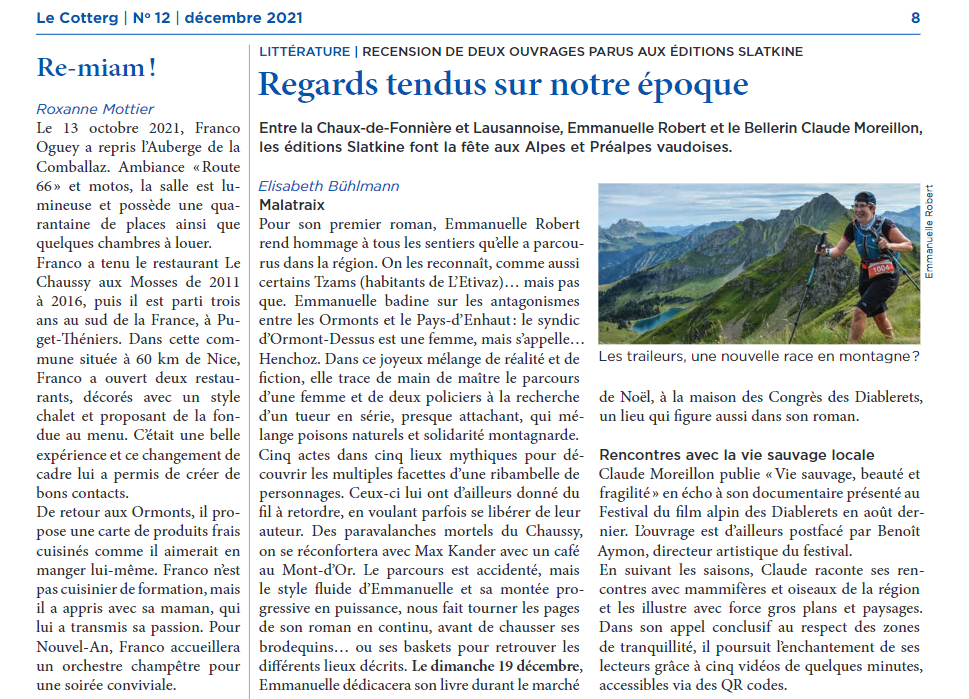 Sur fond d’enquête policière, le roman déroule une intrigue haletante dans un univers inexploré par le polar, le trail, au coeur des somptueux paysages des Préalpes.