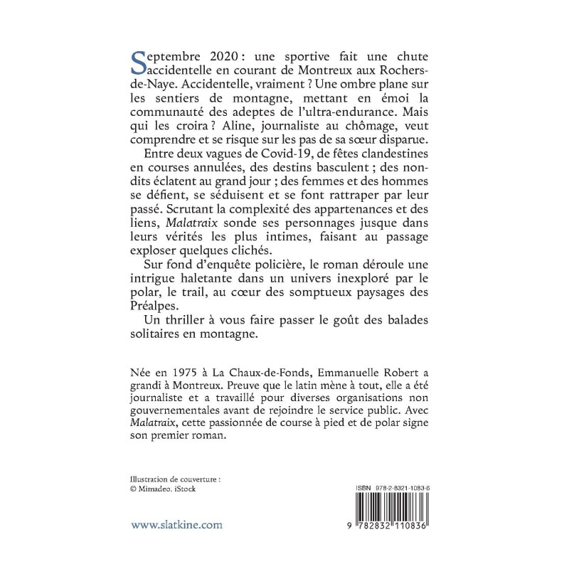 Septembre 2020 : une sportive fait une chute accidentelle en courant de Montreux aux Rochers-de-Naye. Accidentelle, vraiment? Une ombre plane sur les sentiers de montagne, mettant en émoi la communauté des adeptes de l’ultra-endurance. Mais qui les croira ? Aline, journaliste au chômage, veut comprendre et se risque sur les pas de sa soeur disparue.