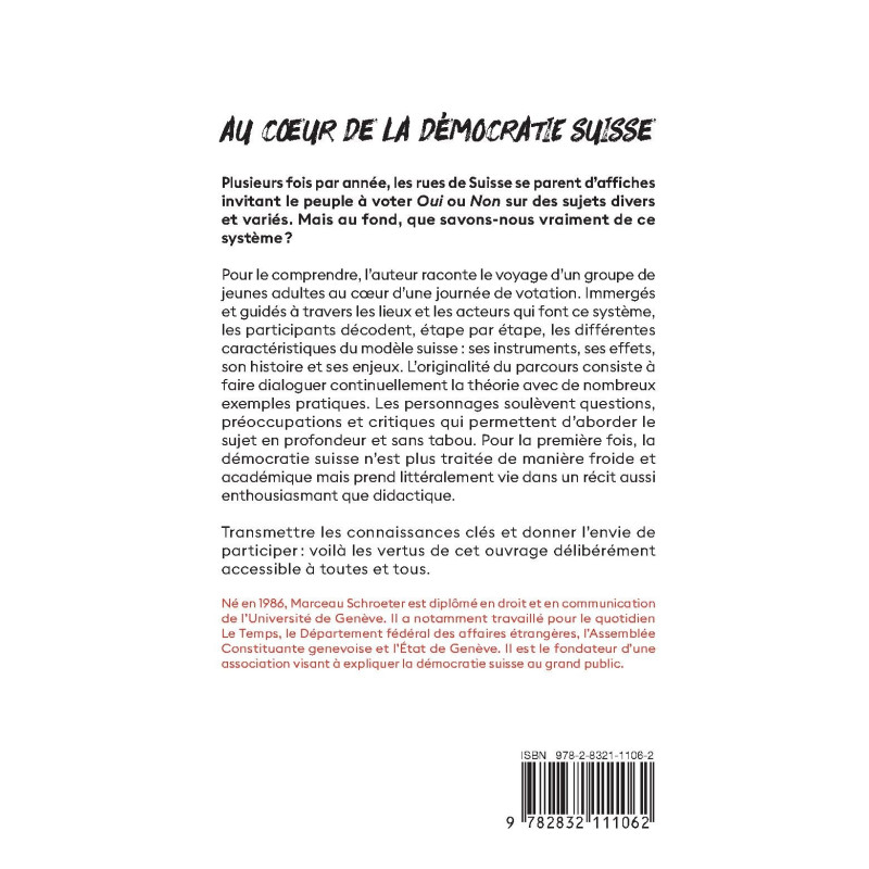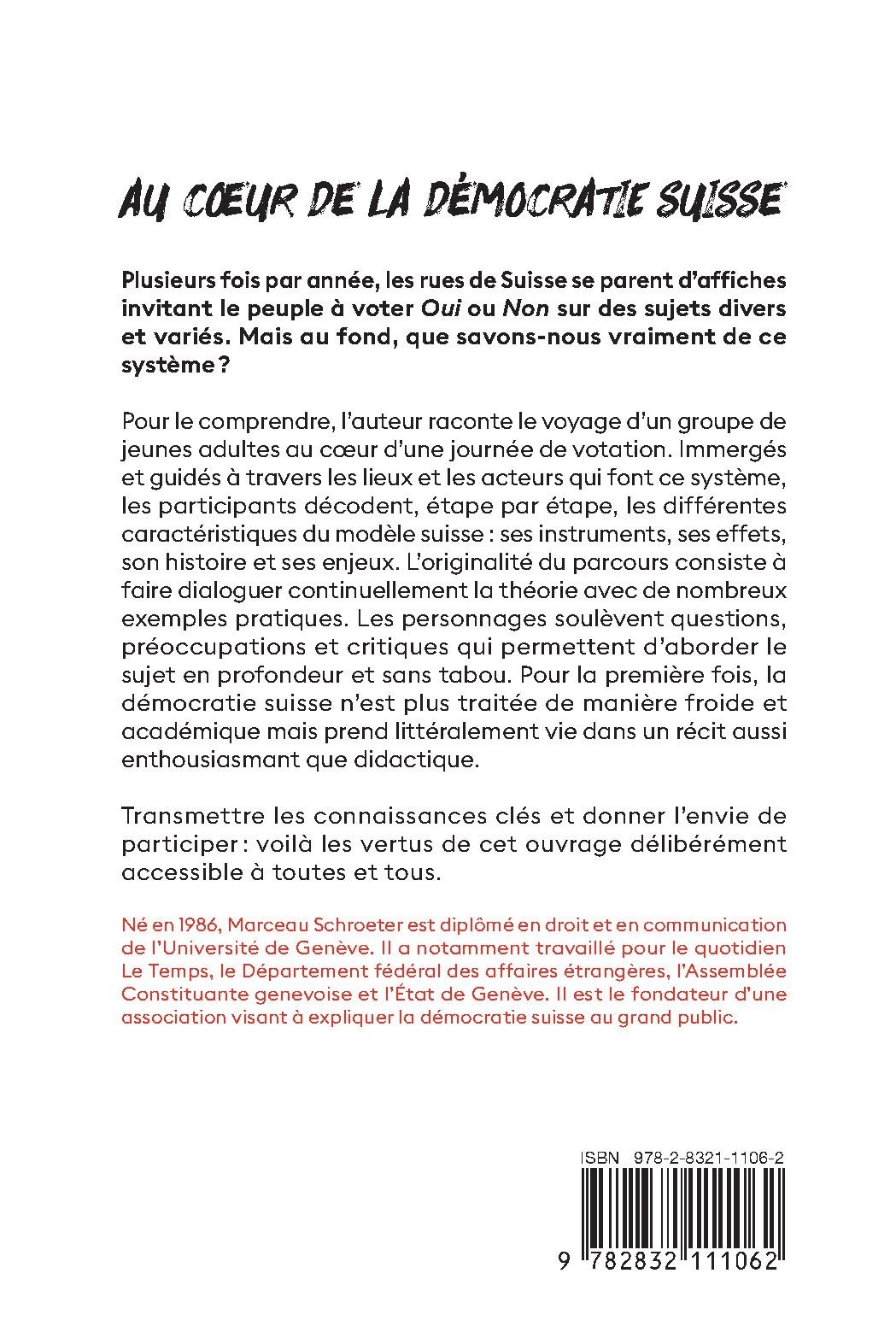 Pour le comprendre, l’auteur raconte le voyage d’un groupe de jeunes adultes au coeur d’une journée de votation. Immergés et guidés à travers les lieux et les acteurs qui font ce système, les participants décodent, étape par étape, les différentes caractéristiques du modèle suisse : ses instruments, ses effets, son histoire et ses enjeux. L’originalité du parcours consiste à faire dialoguer continuellement la théorie avec de nombreux exemples pratiques. Les personnages soulèvent questions, préoccupations et critiques qui permettent d’aborder le sujet en profondeur et sans tabou. Pour la première fois, la démocratie suisse n’est plus traitée de manière froide et académique mais prend littéralement vie dans un récit aussi enthousiasmant que didactique.