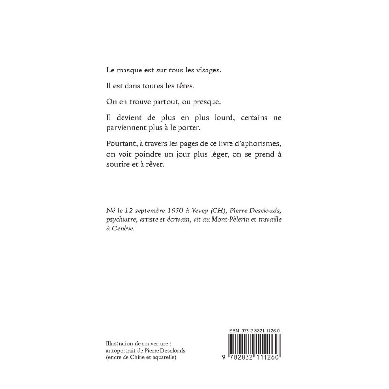 Né le 12 septembre 1950 à Vevey (CH), Pierre Desclouds, psychiatre, artiste et écrivain, vit au Mont-Pèlerin et travaille à Genève.