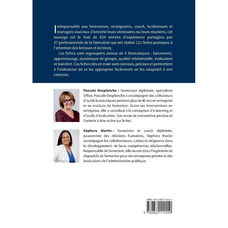 Indispensable aux formateurs, enseignants, coach, facilitateurs et managers soucieux d’enrichir leurs séminaires ou leurs réunions, cet ouvrage est le fruit de 624 années d’expérience partagées par 37 professionnels de la formation qui ont réalisé 121 fiches pratiques à l’attention des lecteurs et lectrices.