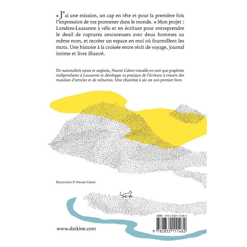 De nationalités suisse et anglaise, Naomi Cahen travaille en tant que graphiste indépendante à Lausanne et développe sa pratique de l’écriture à travers des mandats d’articles et de scénarios. Une chambre à air est son premier livre.