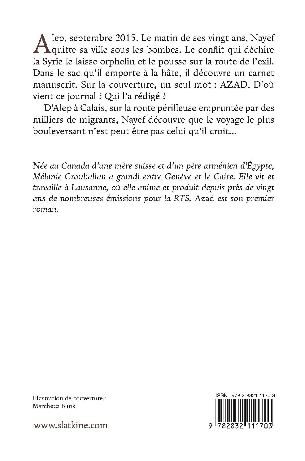 Alep, septembre 2015. Le matin de ses vingt ans, Nayef quitte sa ville sous les bombes. Le conflit qui déchire la Syrie le laisse orphelin et le pousse sur la route de l’exil. Dans le sac qu’il emporte à la hâte, il découvre un carnet manuscrit. Sur la couverture, un seul mot : AZAD. D’où vient ce journal ? Qui l’a rédigé ?