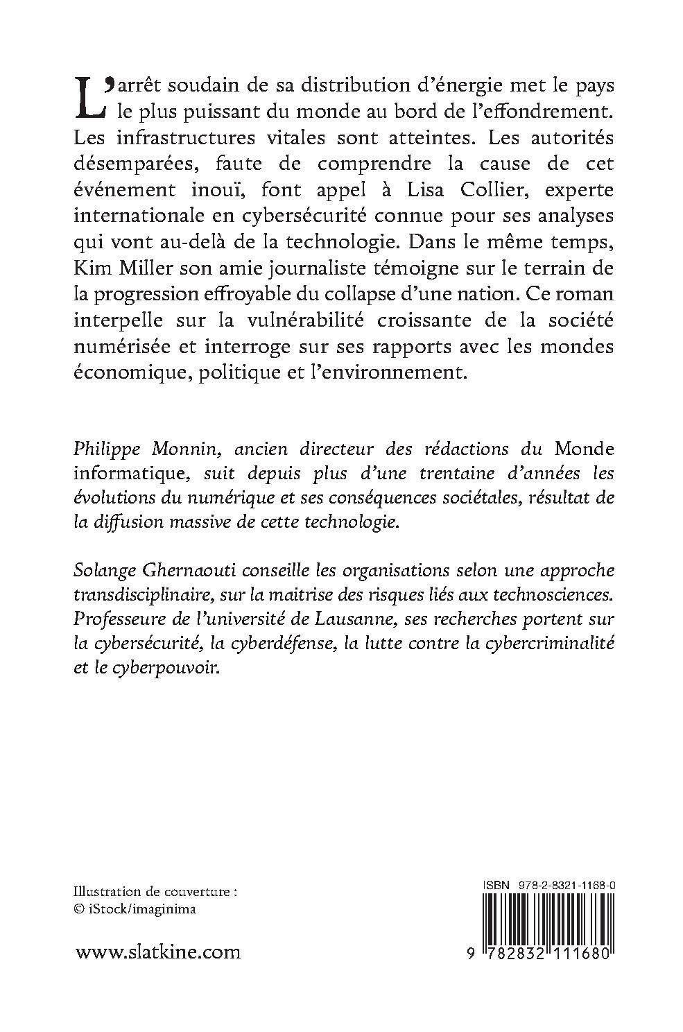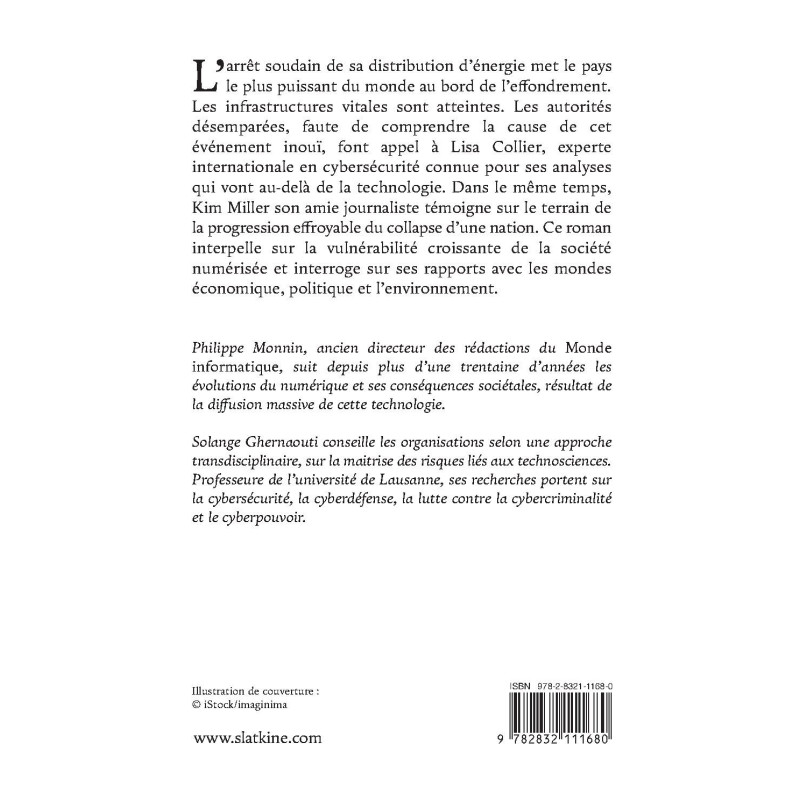 L’arrêt soudain de sa distribution d’énergie met le pays le plus puissant du monde au bord de l’effondrement. Les infrastructures vitales sont atteintes. Les autorités désemparées, faute de comprendre la cause de cet événement inouï, font appel à Lisa Collier, experte internationale en cybersécurité connue pour ses analyses qui vont au-delà de la technologie. Dans le même temps, Kim Miller son amie journaliste témoigne sur le terrain de la progression effroyable du collapse d’une nation. Ce roman interpelle sur la vulnérabilité croissante de la société numérisée et interroge sur ses rapports avec les mondes économique, politique et l’environnement.