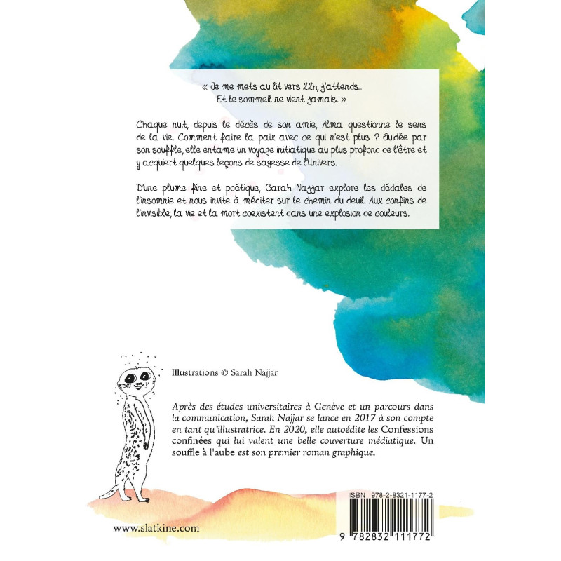 Après des études universitaires à Genève et un parcours dans la communication, Sarah Najjar se lance en 2017 à son compte en tant qu’illustratrice. En 2020, elle autoédite les Confessions confinées qui lui valent une belle couverture médiatique. Un souffle à l'aube est son premier roman graphique.