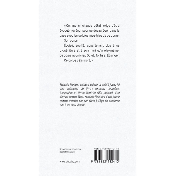 Mélanie Richoz, auteure suisse, a publié jusqu’ici une quinzaine de livres : romans, nouvelles, biographie et livres illustrés (BD, poésie). Son dernier roman, Nani, raconte l’histoire d’une jeune femme vendue par son frère à l’âge de quatorze ans à un mari violent.