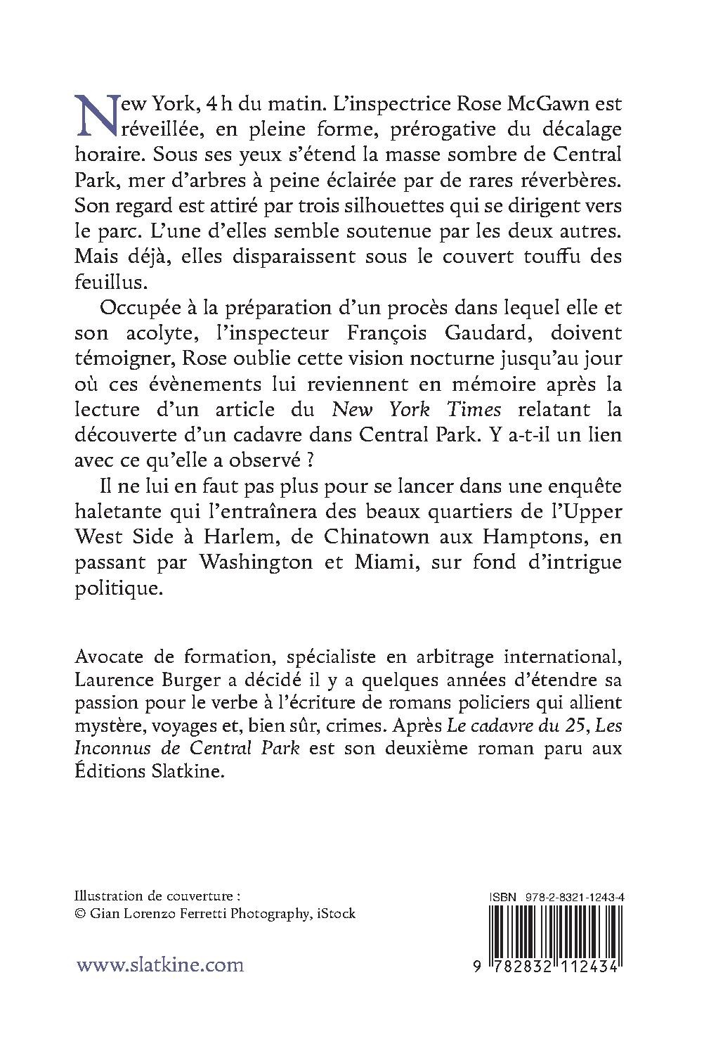 New York, 4h du matin. L’inspectrice Rose McGawn est réveillée, en pleine forme, prérogative du décalage horaire. Sous ses yeux s’étend la masse sombre de Central Park, mer d’arbres à peine éclairée par de rares réverbères. Son regard est attiré par trois silhouettes qui se dirigent vers le parc. L’une d’elles semble soutenue par les deux autres. Mais déjà, elles disparaissent sous le couvert touffu des feuillus.