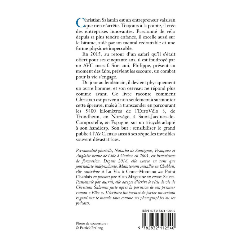 Du jour au lendemain, il devient physiquement un autre homme, et son cerveau ne répond plus comme avant. Ce livre raconte comment Christian est parvenu non seulement à surmonter cette épreuve, mais à la transcender en parcourant les 5400 kilomètres de l’EuroVélo 3, de Trondheim, en Norvège, à Saint-Jacques-de-Compostelle, en Espagne, sur un tricycle adapté à son handicap. Son but : sensibiliser le grand public à l’AVC, mais aussi à ses séquelles invisibles souvent dévastatrices.