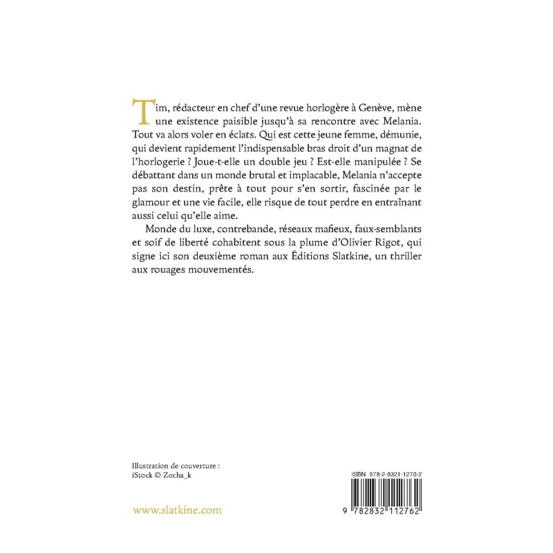 Tim, rédacteur en chef d’une revue horlogère à Genève, mène une existence paisible jusqu’à sa rencontre avec Melania. Tout va alors voler en éclats. Qui est cette jeune femme, démunie, qui devient rapidement l’indispensable bras droit d’un magnat de l’horlogerie ? Joue-t-elle un double jeu ? Est-elle manipulée ? Se débattant dans un monde brutal et implacable, Melania n’accepte pas son destin, prête à tout pour s’en sortir, fascinée par le glamour et une vie facile, elle risque de tout perdre en entraînant aussi celui qu’elle aime.