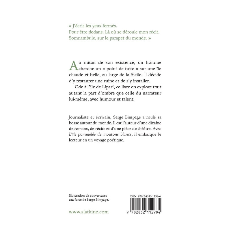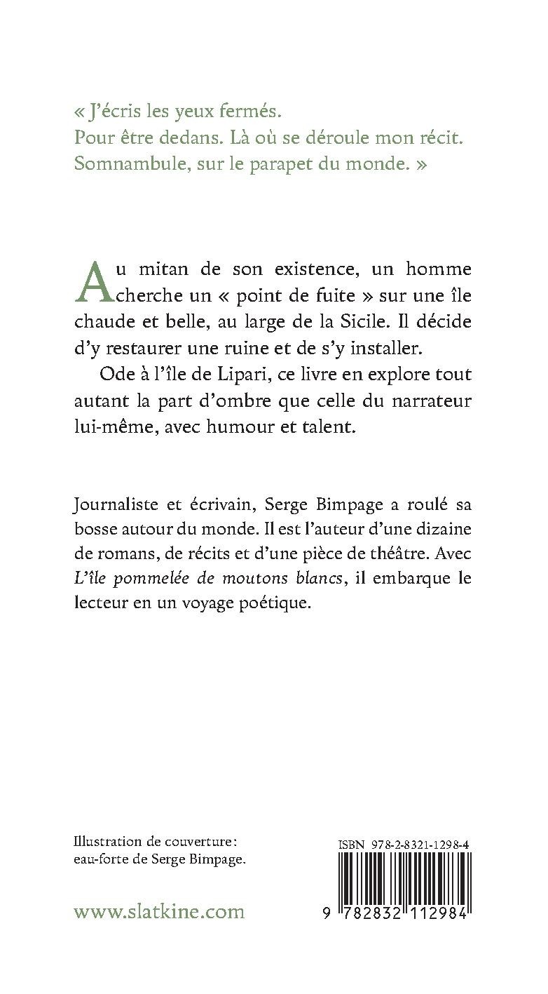Journaliste et écrivain, Serge Bimpage a roulé sa bosse autour du monde. Il est l’auteur d’une dizaine de romans, de récits et d’une pièce de théâtre. Avec L’île pommelée de moutons blancs, il embarque le lecteur en un voyage poétique.
