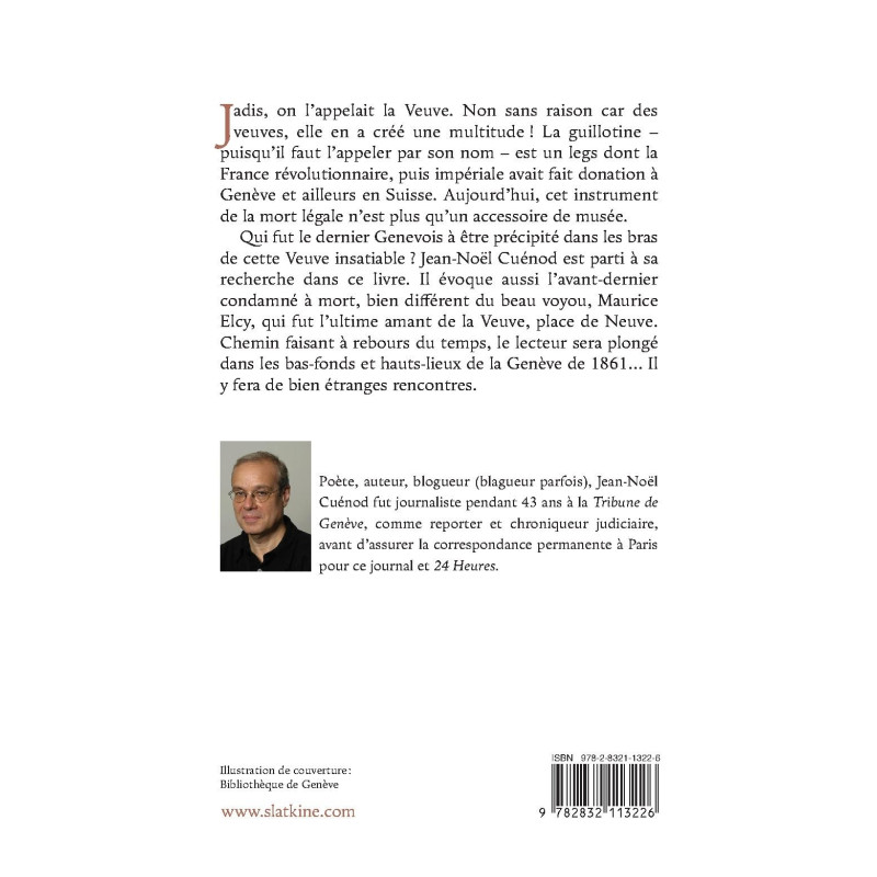 Qui fut le dernier Genevois à être précipité dans les bras de cette Veuve insatiable ? Jean-Noël Cuénod est parti à sa recherche dans ce livre. Il évoque aussi l’avant-dernier condamné à mort, bien différent du beau voyou, Maurice Elcy, qui fut l’ultime amant de la Veuve, place de Neuve. Chemin faisant à rebours du temps, le lecteur sera plongé dans les bas-fonds et hauts-lieux de la Genève de 1861… Il y fera de bien étranges rencontres.