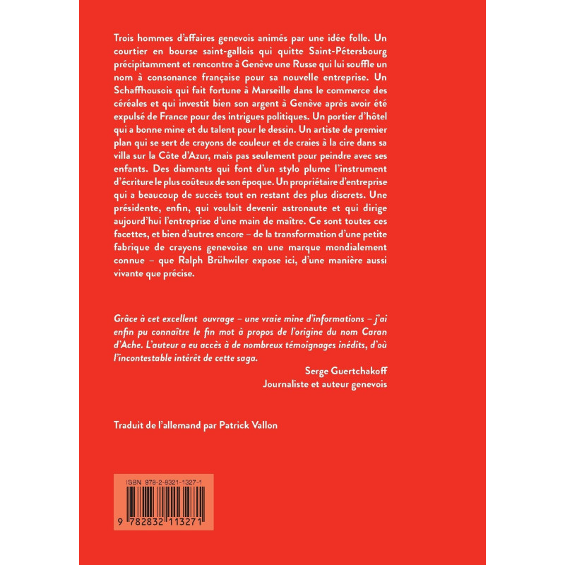 Grâce à cet excellent ouvrage – une vraie mine d’informations – j’ai enfin pu connaître le fi n mot à propos de l’origine du nom Caran d’Ache. L’auteur a eu accès à de nombreux témoignages inédits, d’où l’incontestable intérêt de cette saga.