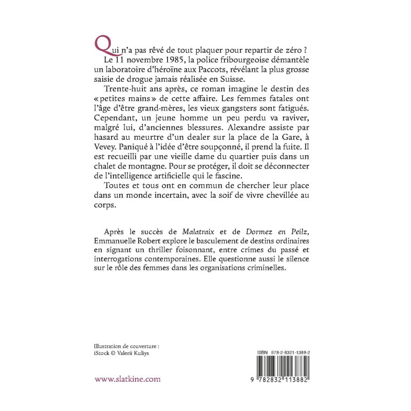 Le 11 novembre 1985, la police fribourgeoise démantèle un laboratoire d’héroïne aux Paccots, révélant la plus grosse saisie de drogue jamais réalisée en Suisse. Trente-huit ans après, ce roman imagine le destin des « petites mains » de cette affaire. Les femmes fatales ont l’âge d’être grand-mères, les vieux gangsters sont fatigués. Cependant, un jeune homme un peu perdu va raviver, malgré lui, d’anciennes blessures. Alexandre assiste par hasard au meurtre d’un dealer sur la place de la Gare, à Vevey. Paniqué à l’idée d’être soupçonné, il prend la fuite. Il est recueilli par une vieille dame du quartier puis dans un chalet de montagne. Pour se protéger, il doit se déconnecter de l’intelligence artificielle qui le fascine.