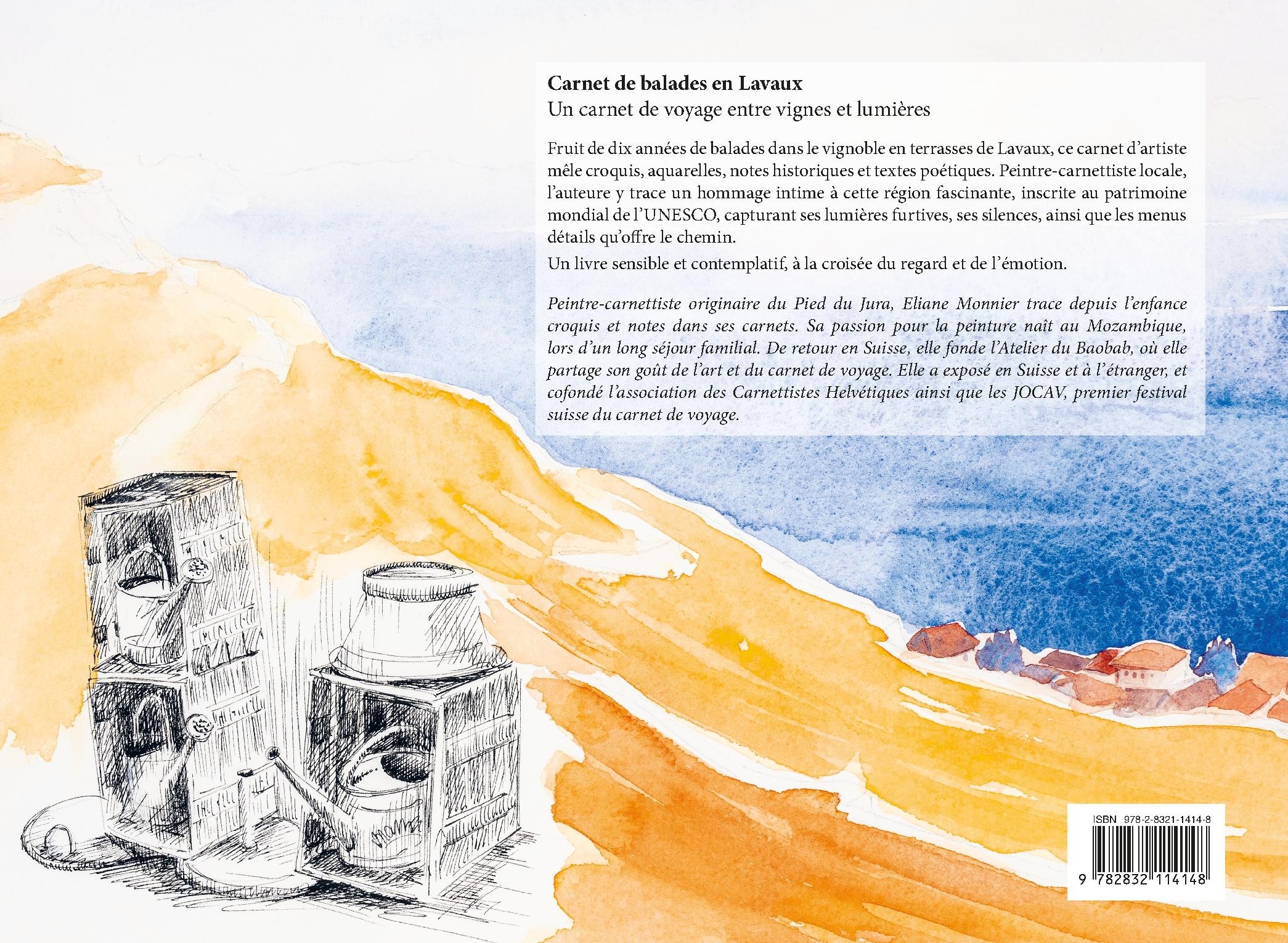 Fruit de dix années de balades dans le vignoble en terrasses de Lavaux, ce carnet d’artiste mêle croquis, aquarelles, notes historiques et textes poétiques. Peintre-carnettiste locale, l’auteure y trace un hommage intime à cette région fascinante, inscrite au patrimoine mondial de l’UNESCO, capturant ses lumières furtives, ses silences, ainsi que les menus détails qu’off re le chemin.