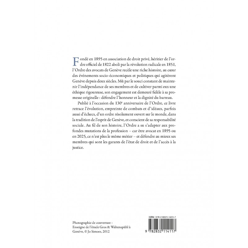 Publié à l’occasion du 130e anniversaire de l’Ordre, ce livre retrace l’évolution, empreinte de combats et d’idéaux, parfois aussi d’échecs, d’un barreau résolument ouvert sur le monde, dans la tradition de l’esprit de Genève, et conscient de sa responsabilité sociale. Au fil de son histoire, l’Ordre a su s’adapter aux profondes mutations de la profession, car être avocat en 1895 ou en 2025 ce n’est plus le même métier. Mais aujourd’hui comme hier, il continue de soutenir ses membres afin que ceux-ci, garants de l’état de droit, assurent aux justiciables un accès effectif à la justice et au droit.