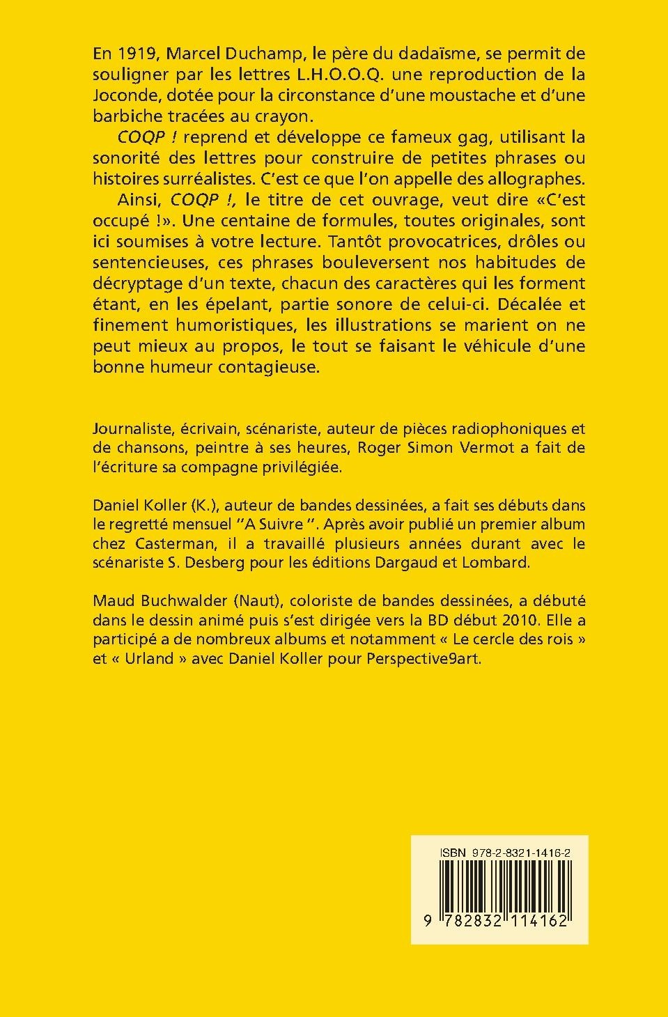 Ainsi, COQP !, le titre de cet ouvrage, veut dire «C’est occupé !». Une centaine de formules, toutes originales, sont ici soumises à votre lecture. Tantôt provocatrices, drôles ou sentencieuses, ces phrases bouleversent nos habitudes de décryptage d’un texte, chacun des caractères qui les forment étant, en les épelant, partie sonore de celui-ci. Décalée et finement humoristiques, les illustrations se marient on ne peut mieux au propos, le tout se faisant le véhicule d’une bonne humeur contagieuse.