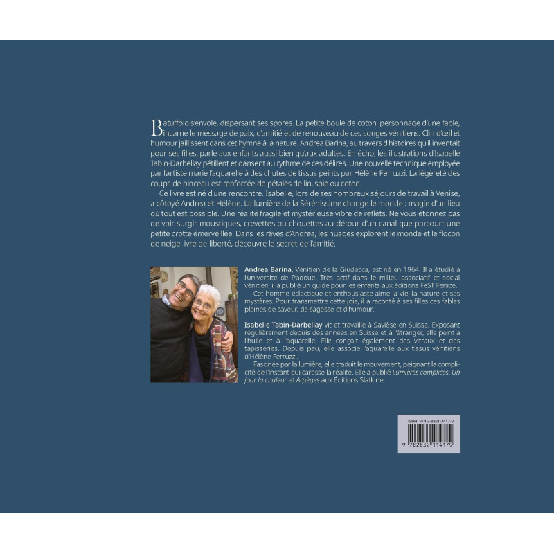 Batuffolo s’envole, dispersant ses spores. La petite boule de coton, personnage d’une fable, incarne le message de paix, d’amitié et de renouveau de ces songes vénitiens. Clin d’œil et humour jaillissent dans cet hymne à la nature. Andrea Barina, au travers d’histoires qu’il inventait pour ses filles, parle aux enfants aussi bien qu’aux adultes. En écho, les illustrations d’Isabelle Tabin-Darbellay pétillent et dansent au rythme de ces délires. Une nouvelle technique employée par l’artiste marie l’aquarelle à des chutes de tissus peints par Hélène Ferruzzi. La légèreté des coups de pinceau est renforcée de pétales de lin, soie ou coton.
