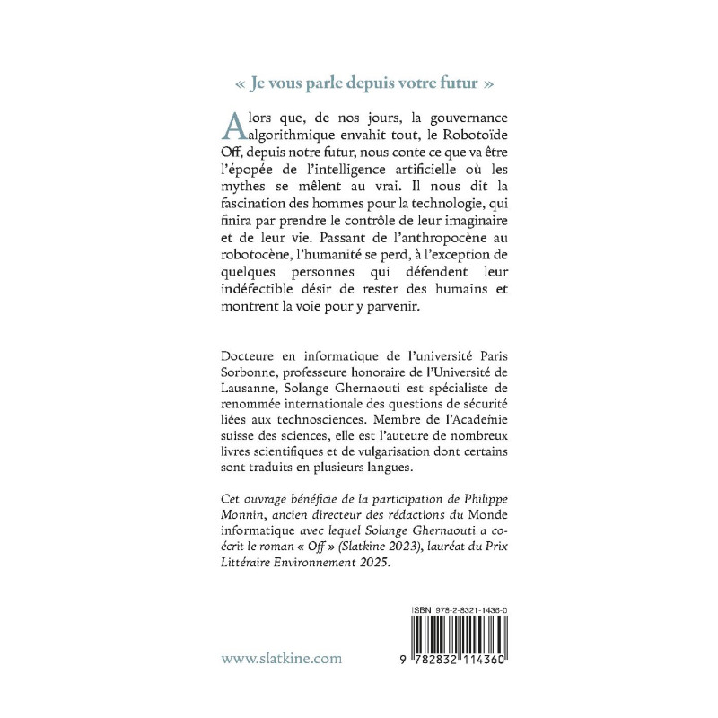Cet ouvrage bénéficie de la participation de Philippe Monnin, ancien directeur des rédactions du Monde informatique avec lequel Solange Ghernaouti a coécrit le roman « Off » (Slatkine 2023), lauréat du Prix Littéraire Environnement 2025.