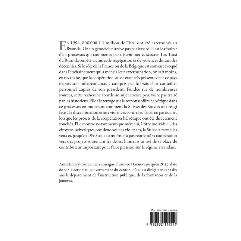 En 1994, 800’000 à 1 million de Tutsi ont été exterminés au Rwanda. Or, un génocide n’arrive pas par hasard. Il est le résultat d’un processus qui commence par discriminer et séparer. Les Tutsi du Rwanda ont été victimes de ségrégation et de violences durant des décennies. Si le rôle de la France ou de la Belgique est souvent évoqué dans l’enchaînement qui a mené à leur extermination, on sait moins, en revanche, que la coopération suisse était très présente dans ce pays depuis son indépendance, y compris par le biais d’un conseiller personnel auprès de son président. Fondée sur de nombreuses sources, cette recherche aborde un sujet encore peu, voire pas traité par les historiens. Elle s’interroge sur la responsabilité helvétique dans ce processus en montrant comment la Suisse/des Suisses ont réagi face à la discrimination et aux violences contre les Tutsi, en particulier lorsque les projets de la coopération helvétique ont été directement touchés. Elle montre notamment que même si, à titre individuel, des citoyens helvétiques ont dénoncé ces violences, la Suisse a fermé les yeux et, jusqu’en 1990 tout au moins, n’a pas réorienté sa coopération vers des projets soutenant les droits humains ni usé de sa place de contributeur important pour faire pression sur le régime rwandais.