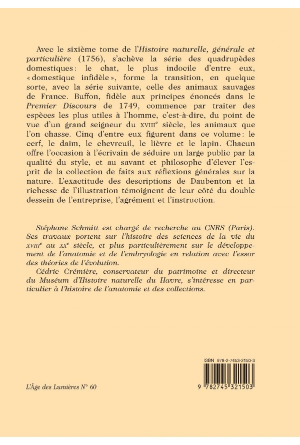 Avec le sixième tome de l`Histoire naturelle, générale et particulière (1756), s`achève la série des quadrupèdes domestiques : le chat, le plus indocile d`entre eux, "domestique infidèle ", forme la transition, en quelque sorte, avec la série suivante, celle des animaux sauvages de France. Buffon, fidèle aux principes énoncés dans le Premier Discours de 1749, commence par traiter des espèces les plus utiles à l`homme, c`est-à-dire, du point de vue d`un grand seigneur du XVIIIe siècle, les animaux que l`on chasse. Cinq d`entre eux figurent dans ce volume : le cerf, le daim, le chevreuil, le lièvre et le lapin. Chacun offre l`occasion à l`écrivain de séduire un large public par la qualité du style, et au savant et philosophe d`élever l`esprit de la collection de faits aux réflexions générales sur la nature. L`exactitude des descriptions de Daubenton et la richesse de l`illustration témoignent de leur côté du double dessein de l`entreprise, l`agrément et l`instruction.