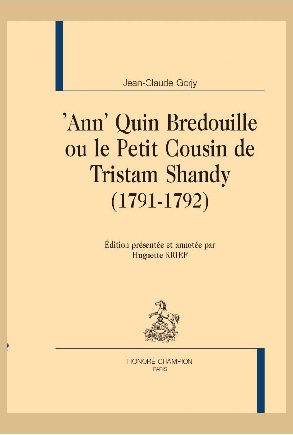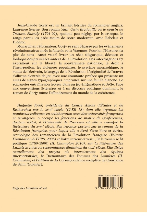 Jean-Claude Gorjy est un brillant héritier du romancier anglais, Laurence Sterne. Son roman ’Ann’ Quin Bredouille ou le cousin de Tristam Shandy (1791-92), quelque peu négligé par la critique, le range parmi les précurseurs de notre modernité, avec Rabelais et Diderot. Monarchien réformateur, Gorjy se sent dépassé par les événements révolutionnaires après la fuite du roi à Varennes. Pour lui, l’Histoire n’a plus de sens ! Aussi va-t-il livrer un récit allégorique, décousu et loufoque des premières années de la Révolution. Des interrogations s’y expriment sur la liberté, la souveraineté nationale, le droit à l’insurrection, les violences populaires, le système monarchique, le statut de l’écrivain, le langage de la Révolution. L’originalité de l’œuvre s’affirme d’entrée de jeu avec une étonnante préface qui présente un amas de signes typographiques, imprimés sur une feuille blanche. Le romancier entraîne son lecteur dans un jeu énigmatique et drôle. Face aux conventions littéraires et à un discours politique dominant, le roman de Gorjy mime l’effondrement du monde de la cohérence. Huguette Krief, présidente du Centre Aixois d’Études et de Recherches sur le XVIIIe siècle (CAER 18) dont elle organise les nombreux colloques en collaboration avec des universités françaises et étrangères, a occupé les fonctions de maître de Conférences, docteur d’état, à l’Université de Provence où elle a enseigné la littérature du XVIIIe siècle. Ses travaux portent sur le roman de la Révolution française, pour lequel elle a livré Vivre libre et écrire. Anthologie des romancières de la Révolution française (Voltaire Foundation & PUPS, 2005) et Entre terreur et vertu, Et le roman se fit politique (1789-1800) (H. Champion 2010), sur la littérature des Lumières et les correspondances féminines du XVIIIe siècle. Elle dirige actuellement des projets où interviennent des équipes internationales, le Dictionnaire des Femmes des Lumières (H. Champion) et l’édition de la Correspondance complète de Constance de Salm (Garnier).