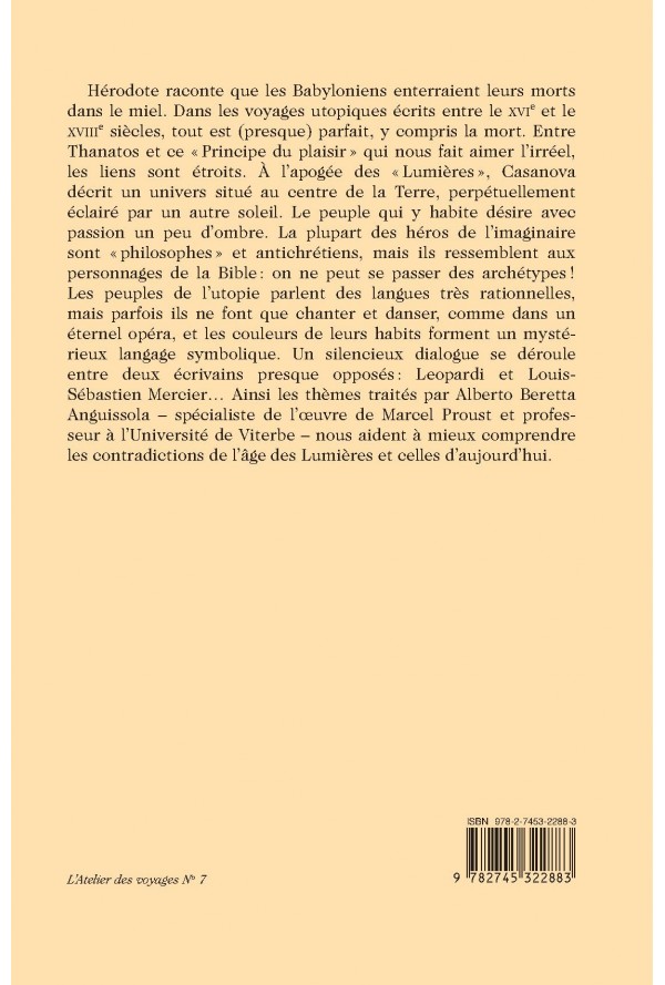 Hérodote raconte que les Babyloniens enterraient leurs morts dans le miel. Dans les voyages utopiques écrits entre le XVIe et le XVIIIe siècles, tout est (presque) parfait, y compris la mort. Entre Thanatos et ce "Principe du plaisir " qui nous fait aimer l`irréel, les liens sont étroits. À l`apogée des "Lumières ", Casanova décrit un univers situé au centre de la Terre, perpétuellement éclairé par un autre soleil. Le peuple qui y habite désire avec passion un peu d`ombre. La plupart des héros de l`imaginaire sont "philosophes " et antichrétiens, mais ils ressemblent aux personnages de la Bible : on ne peut se passer des archétypes ! Les peuples de l`utopie parlent des langues très rationnelles, mais parfois ils ne font que chanter et danser, comme dans un éternel opéra, et les couleurs de leurs habits forment un mystérieux langage symbolique. Un silencieux dialogue se déroule entre deux écrivains presque opposés : Leopardi et Louis- Sébastien Mercier… Ainsi les thèmes traités par Alberto Beretta Anguissola - spécialiste de l`œuvre de Marcel Proust et professeur à l`Université de Viterbe - nous aident à mieux comprendre les contradictions de l`âge des Lumières et celles d`aujourd`hui.
