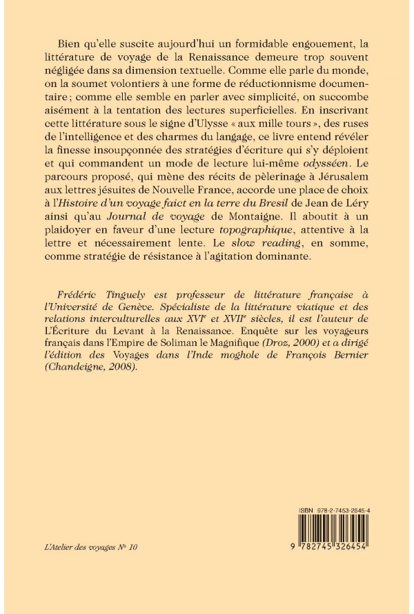 négligée dans sa dimension textuelle. Comme elle parle du monde, on la soumet volontiers à une forme de réductionnisme documentaire ; comme elle semble en parler avec simplicité, on succombe aisément à la tentation des lectures superficielles. En inscrivant cette littérature sous le signe d’Ulysse « aux mille tours », des ruses de l’intelligence et des charmes du langage, ce livre entend révéler la finesse insoupçonnée des stratégies d’écriture qui s’y déploient et qui commandent un mode de lecture lui-même odysséen. Le parcours proposé, qui mène des récits de pèlerinage à Jérusalem aux lettres jésuites de Nouvelle France, accorde une place de choix à l’Histoire d’un voyage faict en la terre du Bresil de Jean de Léry ainsi qu’au Journal de voyage de Montaigne. Il aboutit à un plaidoyer en faveur d’une lecture topographique, attentive à la lettre et nécessairement lente. Le slow reading, en somme, comme stratégie de résistance à l’agitation dominante.