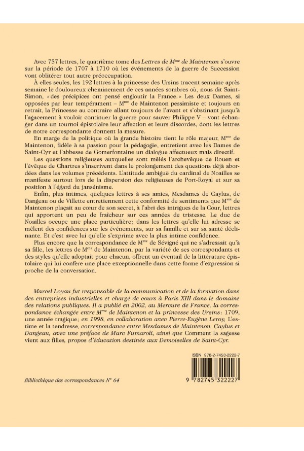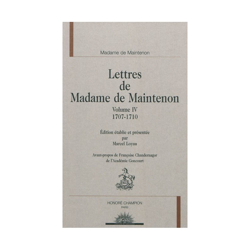 Le quatrième volume de l’édition des lettres de Mme de Maintenon couvre la période de 1707 à 1710. Avec 759 lettres adressées à 61 correspondants, on a le récit des sombres événements qui ont marqué la fin d’un règne accablé de désastres militaires. La place particulière de la princesse des Ursins auprès de Philippe V et de la jeune reine Marie Louise fait l’objet de 192 lettres. Le drame de la guerre de Succession y est sensible avec son cortège de discordes entre les deux correspondantes soutenues malgré tout par une estime mêlée d’affection. Les querelles religieuses qu’on a suivies dans les ouvrages précédents connaissent une pause, mais les nominations de l’archevêque de Rouen, Claude Maur d’Aubigny, et du successeur de Godet des Marais à l’évêché de Chartres, François de Mérinville, occupent Mme de Maintenon qui veille, en Mère, au sort de l’Église. Les Dames de Saint-Cyr et l’abbesse de Gomerfontaine ainsi que les chères amies intimes de sa petite Cabale affectueuse apportent un éclairage touchant sur cette période où la grande histoire jette son ombre sur l’Europe entière. Cette correspondance, jamais entièrement publiée, offre enfin aux historiens et aux curieux de la Cour de Louis XIV le portrait d’une femme longtemps et arbitrairement jugée qui mérite une place exceptionnelle dans la littérature épistolaire.