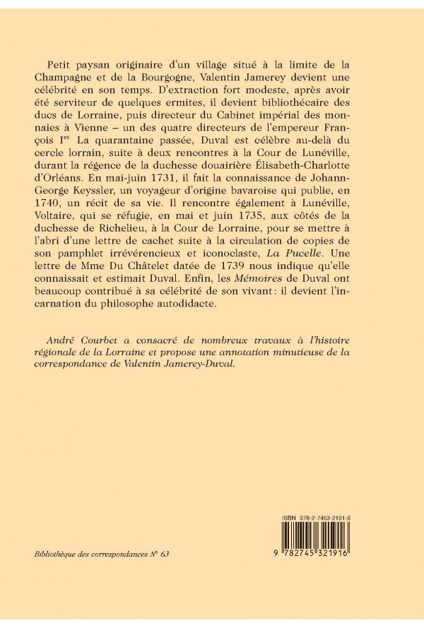 Petit paysan originaire d`un village situé à la limite de la Champagne et de la Bourgogne, Valentin Jamerey devient une célébrité en son temps. D`extraction fort modeste, après avoir été serviteur de quelques ermites, il devient bibliothécaire des ducs de Lorraine, puis directeur du Cabinet impérial des monnaies à Vienne - un des quatre directeurs de l`empereur François Ier. La quarantaine passée, Duval est célèbre au-delà du cercle lorrain, suite à deux rencontres à la Cour de Lunéville, durant la régence de la duchesse douairière Élisabeth-Charlotte d`Orléans. En mai-juin 1731, il fait la connaissance de Johann- George Keyssler, un voyageur d`origine bavaroise qui publie, en 1740, un récit de sa vie. Il rencontre également à Lunéville, Voltaire, qui se réfugie, en mai et juin 1735, aux côtés de la duchesse de Richelieu, à la Cour de Lorraine, pour se mettre à l`abri d`une lettre de cachet suite à la circulation de copies de son pamphlet irrévérencieux et iconoclaste, La Pucelle. Une lettre de Mme Du Châtelet datée de 1739 nous indique qu`elle connaissait et estimait Duval. Enfin, les Mémoires de Duval ont beaucoup contribué à sa célébrité de son vivant : il devient l`incarnation du philosophe autodidacte. André Courbet a consacré de nombreux travaux à l`histoire régionale de la Lorraine et propose une annotation minutieuse de la correspondance de Valentin Jamerey-Duval.
