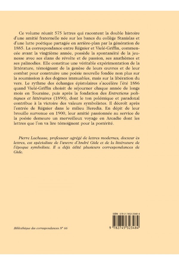 Ce volume réunit 575 lettres qui racontent la double histoire d’une amitié fraternelle née sur les bancs du collège Stanislas et d’une lutte poétique partagée en arrière-plan par la génération de 1885. La correspondance entre Régnier et Vielé-Griffin, commencée avant la vingtième année, possède la spontanéité de la jeunesse avec ses élans de révolte et de passion, ses anathèmes et ses palinodies. Elle constitue une véritable expérimentation de la littérature, témoignant de la genèse de leurs œuvres et de leur combat pour construire une poésie nouvelle fondée non plus sur la soumission à des dogmes immuables, mais sur la libération du vers. Le rythme des échanges épistolaires s’accélère l’été 1886 quand Vielé-Griffin choisit de séjourner chaque année de longs mois en Touraine, puis après la fondation des Entretiens politiques et littéraires (1890), dont le ton polémique et paradoxal contribue à la victoire des valeurs symbolistes. Il décroît après l’entrée de Régnier dans le milieu Heredia. En dépit de leur brouille survenue en 1900, leur amitié passionnée au service de la poésie demeure un merveilleux voyage en Arcadie dont les lettres que l’on va lire témoignent pour la postérité. Pierre Lachasse, professeur agrégé de lettres modernes, docteur ès lettres, est spécialiste de l’oeuvre d’André Gide et de la littérature de l’époque symboliste. Il a déjà édité plusieurs correspondances de Gide.