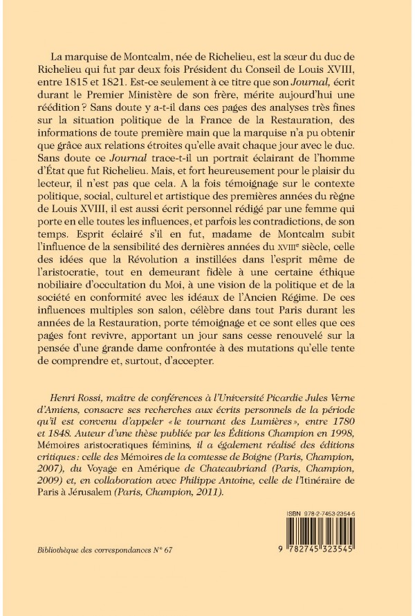 La marquise de Montcalm, née de Richelieu, est la sœur du duc de Richelieu qui fut par deux fois Président du Conseil de Louis XVIII, entre 1815 et 1821. Est-ce seulement à ce titre que son Journal, écrit durant le Premier Ministère de son frère, mérite aujourd’hui une réédition? Sans doute y a-t-il dans ces pages des analyses très fines sur la situation politique de la France de la Restauration, des informations de toute première main que la marquise n’a pu obtenir que grâce aux relations étroites qu’elle avait chaque jour avec le duc. Sans doute ce Journal trace-t-il un portrait éclairant de l’homme d’État que fut Richelieu. Mais, et fort heureusement pour le plaisir du lecteur, il n’est pas que cela. A la fois témoignage sur le contexte politique, social, culturel et artistique des premières années du règne de Louis XVIII, il est aussi écrit personnel rédigé par une femme qui porte en elle toutes les influences, et parfois les contradictions, de son temps. Esprit éclairé s’il en fut, madame de Montcalm subit l’influence de la sensibilité des dernières années du XVIIIe siècle, celle des idées que la Révolution a instillées dans l’esprit même de l’aristocratie, tout en demeurant fidèle à une certaine éthique nobiliaire d’occultation du Moi, à une vision de la politique et de la société en conformité avec les idéaux de l’Ancien Régime. De ces influences multiples son salon, célèbre dans tout Paris durant les années de la Restauration, porte témoignage et ce sont elles que ces pages font revivre, apportant un jour sans cesse renouvelé sur la pensée d’une grande dame confrontée à des mutations qu’elle tente de comprendre et, surtout, d’accepter.