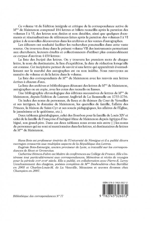 Ce volume VII de l’édition intégrale et critique de la correspondance active de Mme de Maintenon comprend 184 lettres et billets recueillis après la parution des volumes I à VI, des lettres non datées et non datables, ainsi que quelques documents et réactualisations de références faites après la parution des volumes I à VI grâce à de nouvelles découvertes dans les archives et les ventes d’autographes. Les éditeurs ont souhaité faciliter les recherches ponctuelles dans cette vaste source. On trouvera donc dans le présent volume VII des instruments permettant aux chercheurs, lecteurs érudits et collectionneurs d’utiliser plus commodément ce corpus d’environ 4450 lettres: La liste des « Incipit » des lettres. On y trouvera les premiers mots de chaque lettre, le nom du destinataire, le lieu d’expédition, la date de rédaction lorsqu’elle est connue. Cet incipitaire permet de savoir si une lettre qui apparaîtrait éventuellement sur le marché des autographes est ou non inédite. Nous renvoyons au numéro du volume et de la lettre dans le volume. La liste des correspondants de Mme de Maintenon avec les renvois aux lettres écrites à chacun d’eux. La liste des archives et bibliothèques détenant des lettres de Mme de Maintenon, autographes ou en copie, avec les cotes des recueils ou liasses. Une bibliographie chronologique des éditions successives de lettres de Mme de Maintenon, depuis l’édition de Laurent Angliviel de La Beaumelle en 1755-1756. Un index des noms de personnes, de lieux et de thèmes. Deux tableaux généalogiques, celui des Bourbon pour la famille de Louis XIV et celui de la famille de Françoise d’Aubigné-Mme de Maintenon depuis Agrippa d’Aubigné, son grand-père. Dans ces deux tableaux nous avons mis entre { } les noms de personnes qui ne sont ni mentionnées dans les les lettres, ni destinataires de lettres de Mme de Maintenon.