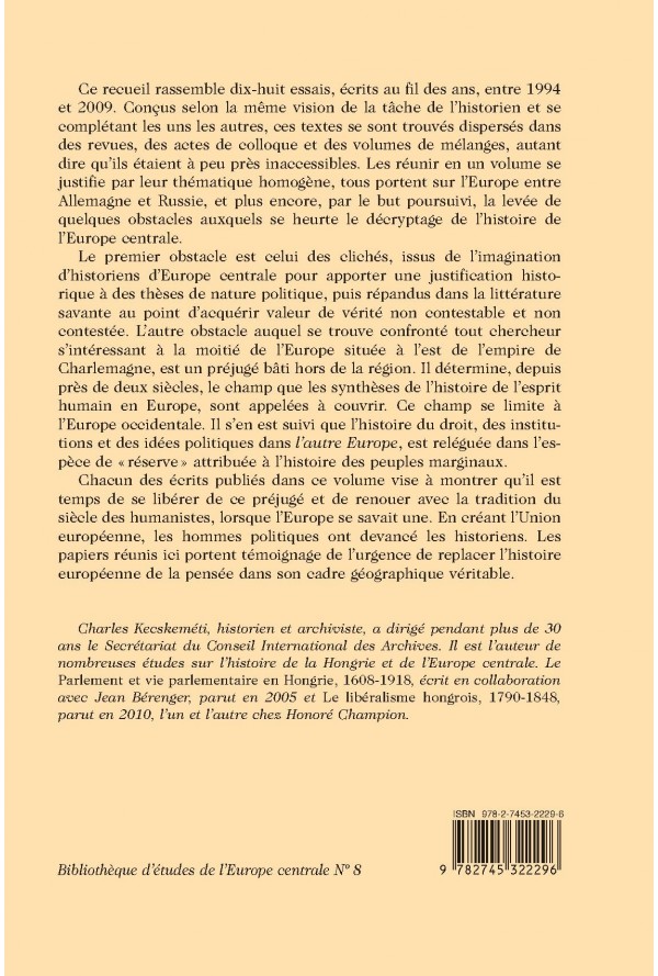Ce recueil, rassemble dix-huit essais se complétant les uns les autres mais devenus à peu près inaccessibles. Tous portent sur l’Europe entre Allemagne et Russie, et visent à lever de quelques obstacles auxquels se heurte le décryptage de l’histoire de l’Europe centrale. Le premier obstacle est celui des clichés, issus de l’imagination d’historiens d’Europe centrale pour apporter une justification historique à des thèses de nature politique. L’autre obstacle auquel se trouve confronté tout chercheur s’intéressant à la moitié de l’Europe située à l’est de l’empire de Charlemagne, est un préjugé bâti hors de la région que constitue l’Europe occidentale. Il s’en est suivi que l’histoire du droit, des institutions et des idées politiques dans l’autre Europe, est reléguée dans l’espèce de « réserve » attribuée à l’histoire des peuples marginaux. Chacun des écrits publiés dans ce volume vise à montrer qu’il est temps de se libérer de ce préjugé et de renouer avec la tradition du siècle des humanistes. Les papiers réunis ici portent témoignage de l’urgence de replacer l’histoire européenne de la pensée dans son cadre géographique véritable.
