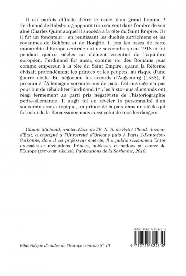 Il est parfois difficile d’être le cadet d’un grand homme! Ferdinand de Habsbourg apparaît trop souvent dans l’ombre de son aîné Charles Quint auquel il succéda à la tête du Saint Empire. Or il fut un fondateur : en réunissant les duchés autrichiens et les royaumes de Bohême et de Hongrie, il jeta les bases de cette monarchie d’Europe centrale qui ne succomba qu’en 1918 et fut pendant quatre siècles un élément essentiel de l’équilibre européen. Ferdinand fut aussi, comme roi des Romains puis comme empereur, à la tête du Saint Empire, quand la Réforme divisait profondément les princes et les peuples, au risque d’une guerre civile. En négociant les accords d’Augsbourg (1555), il procura à l’Allemagne soixante ans de paix. Cet ouvrage n’a pas pour but de réhabiliter Ferdinand 1er ; les historiens allemands ont réagi fermement au parti pris négativiste de l’historiographie petite-allemande. Il s’agit ici de révéler la personnalité d’un souverain assez atypique, un prince de la paix dans un siècle qui fut celui de la Renaissance mais aussi celui de tous les dangers.