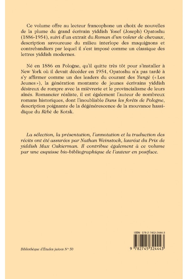 Ce volume offre au lecteur francophone un choix de nouvelles de la plume du grand écrivain yiddish Yosef (Joseph) Opatoshu (1886-1954), suivi d’un extrait du Roman d’un voleur de chevaux, description savoureuse du milieu interlope des maquignons et contrebandiers par lequel il s’est imposé comme un classique des lettres yiddish modernes. Né en 1886 en Pologne, qu’il quitte très tôt pour s’installer à New York où il devait décéder en 1954, Opatoshu n’a pas tardé à s’y affirmer comme un des leaders du courant des Yungè (« Les Jeunes »), la génération montante de jeunes écrivains yiddish désireux de rompre avec la mièvrerie et le provincialisme de leurs aînés. Romancier réaliste, il est également l’auteur de nombreux romans historiques, dont l’inoubliable Dans les forêts de Pologne, description poignante de la dégénérescence de la mouvance hassidique du Rèbè de Kotsk.