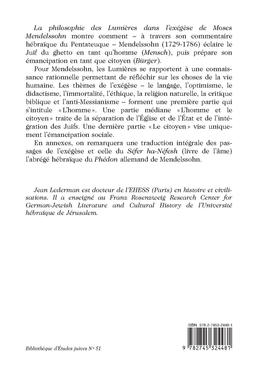 La philosophie des Lumières dans l’exégèse de Moses Mendelssohn montre comment – à travers son commentaire hébraïque du Pentateuque – Mendelssohn (1729-1786) éclaire le Juif du ghetto en tant qu’homme (Mensch), puis prépare son émancipation en tant que citoyen (Bürger). Pour Mendelssohn, les Lumières se rapportent à une connaissance rationnelle permettant de réfléchir sur les choses de la vie humaine. Les thèmes de l’exégèse – le langage, l’optimisme, le didactisme, l’immortalité, l’éthique, la religion naturelle, la critique biblique et l’anti-Messianisme – forment une première partie qui s’intitule « L’homme. » Une partie médiane « L’homme et le citoyen » traite de la séparation de l’Église et de l’État et de l’intégration des Juifs. Une dernière partie « Le citoyen » vise uniquement l’émancipation sociale. En annexes, on remarquera une traduction intégrale des passages de l’exégèse et celle du Séfer ha-Néfesh (livre de l’âme) l’abrégé hébraïque du Phédon allemand de Mendelssohn.