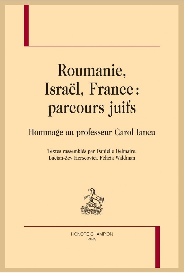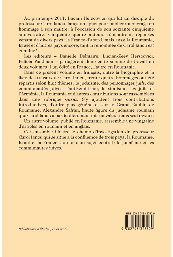 liste des travaux de Carol Iancu, trente quatre hommages ont été répartis selon huit thèmes : le judaïsme, des personnages juifs, des communautés juives, l’antisémitisme, le sionisme, les juifs et l’Arménie, la Roumanie et d’autres contributions sont rassemblées dans une rubrique varia. S’y ajoutent trois contributions introductives, d’ordre plus général et sur le Grand Rabbin de Roumanie, Alexandre Safran, haute figure du judaïsme roumain que Carol Iancu a particulièrement mis en valeur dans ses travaux.