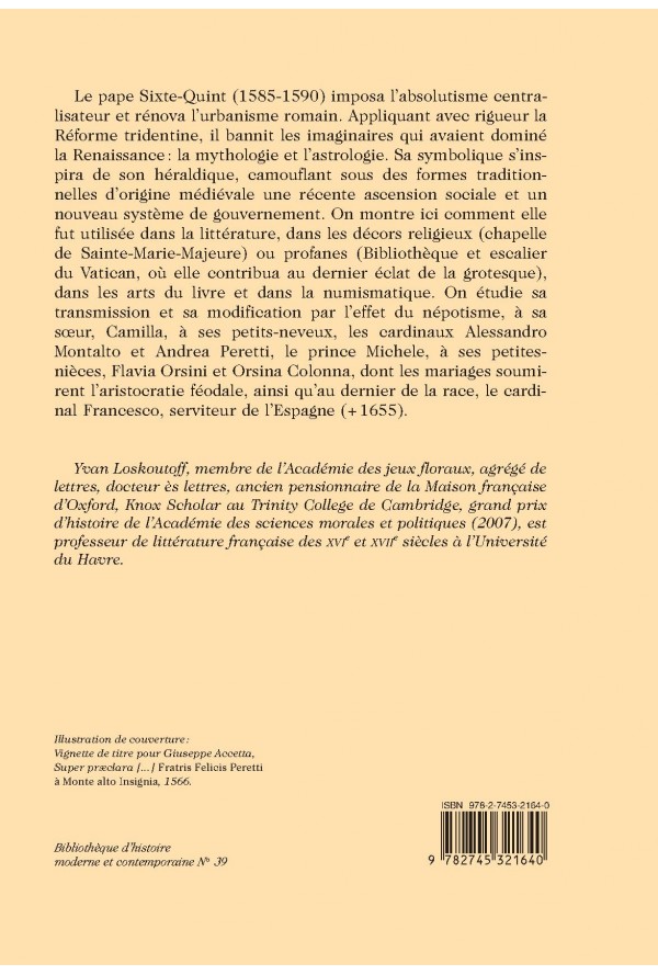 Le pape Sixte-Quint (1585-1590) imposa l`absolutisme centralisateur et rénova l`urbanisme romain. Appliquant avec rigueur la Réforme tridentine, il bannit les imaginaires qui avaient dominé la Renaissance : la mythologie et l`astrologie. Sa symbolique s`inspira de son héraldique, camouflant sous des formes traditionnelles d`origine médiévale une récente ascension sociale et un nouveau système de gouvernement. On montre ici comment elle fut utilisée dans la littérature, dans les décors religieux (chapelle de Sainte-Marie-Majeure) ou profanes (Bibliothèque et escalier du Vatican, où elle contribua au dernier éclat de la grotesque), dans les arts du livre et dans la numismatique. On étudie sa transmission et sa modification par l`effet du népotisme, à sa soeur, Camilla, à ses petits-neveux, les cardinaux Alessandro Montalto et Andrea Peretti, le prince Michele, à ses petitesnièces, Flavia Orsini et Orsina Colonna, dont les mariages soumirent l`aristocratie féodale, ainsi qu`au dernier de la race, le cardinal Francesco, serviteur de l`Espagne (+ 1655). Yvan Loskoutoff, membre de l`Académie des jeux floraux, agrégé de lettres, docteur ès lettres, ancien pensionnaire de la Maison française d`Oxford, Knox Scholar au Trinity College de Cambridge, grand prix d`histoire de l`Académie des sciences morales et politiques (2007), est professeur de littérature française des XVIe et XVIIe siècles à l`Université du Havre.