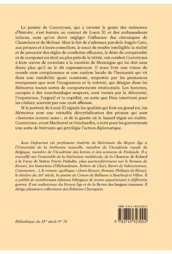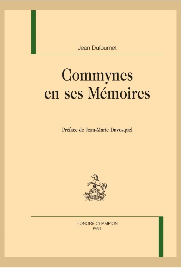 La pensée de Commynes, qui a inventé le genre des mémoires d`histoire, s`est formée au contact de Louis XI et des ambassadeurs italiens, sans qu`on doive négliger l`influence des chroniques de Cha stelain et de Molinet. Mais le fait de s`adresser, par-delà Angelo Cato, aux princes et à leurs conseillers, le souci de rendre intelligible la réalité et de procurer des règles de conduites efficace s, le désir de comprendre et de composer un récit au plus près de la vérité, ont conduit Commynes à faire œuvre de moraliste à la manière de Montaigne qui lui doit sans doute plus qu`il ne le dit exp ressément. Il nous livre une vision du monde sans complaisance et une analyse lucide de l`humanité qui vit dans une instabilité quasi constante, emportée par les puissances trompeuses que sont l`ima gination et la volonté, qui désigne dans les Mémoires toutes sortes de comportements irrationnels. Les hommes, occupés à des marchandages suspects, sont menés par la déloyauté, l`impatience, l`orgue il et la cupidité, en sorte que Dieu intervient pour les châtier, souvent par une mort affreuse. Si le portrait de Louis XI signale les qualités qui font un grand roi, les Mémoires sont une véritable démythification des princes qui sont "hommes comme nous", et de la guerre où le hasard règne en maître. Commynes, avant Machiavel et Guichardin, a écrit pour les gouvernants une sorte de bréviaire qui privilégie l`action diplomatique. //Bibliograhie générale des travaux de Jean Dufournet (1964-2010) établie par Claude Lachet.