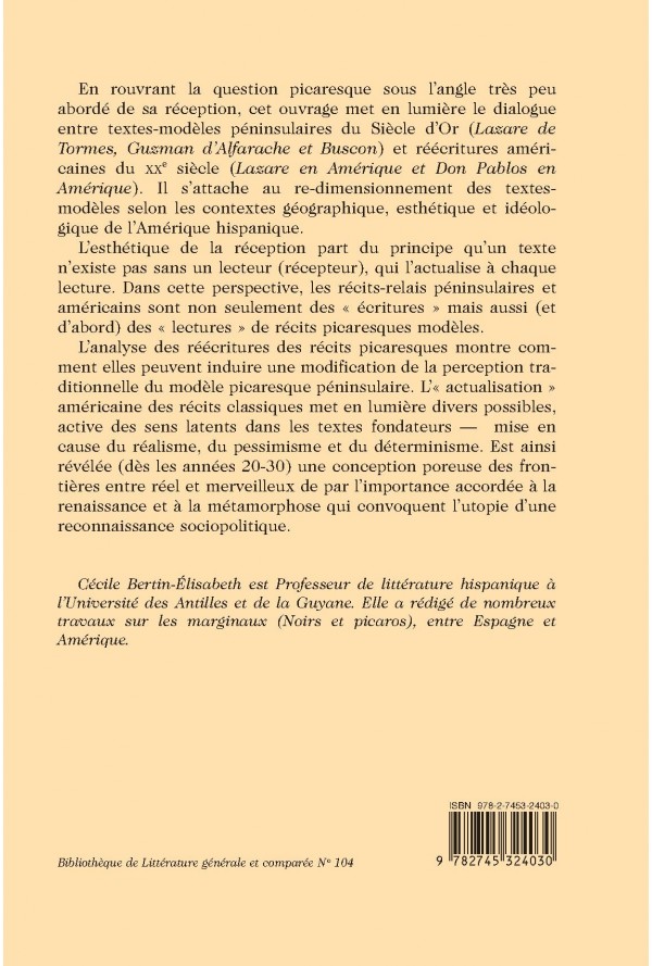 En rouvrant la question picaresque sous l’angle très peu abordé de sa réception, cet ouvrage met en lumière le dialogue entre textes-modèles péninsulaires du Siècle d’Or (Lazare de Tormes, Guzman d’Alfarache et Buscon) et réécritures américaines du XXe siècle (Lazare en Amérique et Don Pablos en Amérique). Il s’attache au re-dimensionnement des textes modèles selon les contextes géographique, esthétique et idéologique de l’Amérique hispanique. L’esthétique de la réception part du principe qu’un texte n’existe pas sans un lecteur (récepteur), qui l’actualise à chaque lecture. Dans cette perspective, les récits-relais péninsulaires et américains sont non seulement des « écritures » mais aussi (et d’abord) des « lectures » de récits picaresques modèles. L’analyse des réécritures des récits picaresques montre comment elles peuvent induire une modification de la perception traditionnelle du modèle picaresque péninsulaire. L’« actualisation » américaine des récits classiques met en lumière divers possibles, active des sens latents dans les textes fondateurs — mise en cause du réalisme, du pessimisme et du déterminisme. Est ainsi révélée (dès les années 20-30) une conception poreuse des frontières entre réel et merveilleux de par l’importance accordée à la renaissance et à la métamorphose qui convoquent l’utopie d’une reconnaissance sociopolitique.